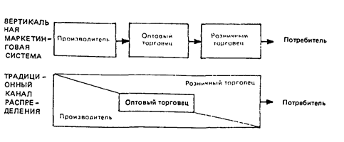 Одним из наиболее значительных событий последнего времени стало появление вертикальных маркетинговых систем, бросающих вызов традиционным каналам распределения. На рис. 3 дается сравнение двух структурных схем каналов.