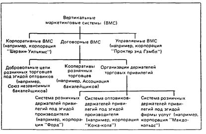 Вертикальная маркетинговая система (ВМС), наоборот, состоит из производителя, одного или нескольких оптовых торговцев и одного или нескольких розничных торговцев, действующих как единая система. В этом случае один из членов канала либо является владельцем остальных, либо предоставляет им торговые привилегии, либо обладает мощью, обеспечивающей их полное сотрудничество. Доминирующей силой в рамках вертикальной маркетинговой системы может быть либо производитель, либо оптовик, либо розничный торговец. ВМС возникли как средство контроля за поведением канала и предотвращения конфликтов между его отдельными членами, преследующими собственные цели. ВМС экономичны с точки зрения своих размеров, обладают большой рыночной властью и исключают дублирование усилий. ВМС стали преобладающей формой распределения в сфере потребительского маркетинга, где ими охвачено уже 64% всего рынка.
