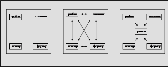 Чтобы разобраться в природе рынка, представим себе примитивное экономическое сообщество из четырех человек: рыбака , охотника, гончара и фермера. На рис.3 представлены три разных способа удовлетворения этими людьми своих нужд. Первый способ - самообеспечение , когда каждый из них может самостоятельно добыть для себя все необходимое. Так, рыбак, проводя большую часть времени за ловлей рыбы, в остальное время и охотится, и гончарит, и занимается сельским хозяйством, чтобы обеспечить себя всем, что ему нужно. При этом эффективность его занятий рыбной ловлей снижается так же, как и эффективность занятий своим основным делом у других.