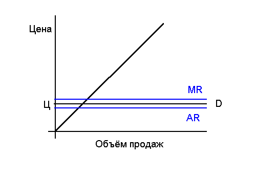 Таким образом, в условиях чистой конкуренции, когда цена на продукцию на рынке едина для всех, график среднего дохода (AR) и предельного (MR) совпадают и не зависят от изменения объёма продаж.