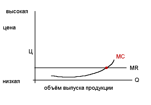 При условии выпуска каждой дополнительной единицы продукции до тех пор, пока предельные издержки будут меньше предельного дохода, фирма будет стремиться к расширению объёма производства. Как только последующая единица продукции прибавит к предельному доходу меньше, чем предельным издержкам, фирма будет нести убытки. Точка пересечения обоих графиков называется оптимальной точкой выпуска. При увеличении производства фирма будет в невыгодной ситуации. На основании этих соображений строится политика ценообразования в условиях рынка чистой конкуренции, которую кратко можно описать следующей формулой.
