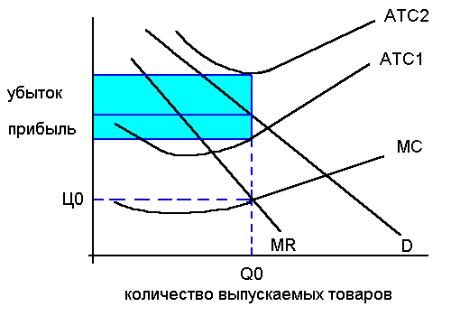 В краткосрочный период производитель на рынке монополистической конкуренции стремится максимизировать свою прибыль и минимизировать свои убытки. Достижение этой цели возможно только при условии производства определённого количества продукции. Необходимый объём продукции в условиях монополистической конкуренции определяется путём пересечения графика предельного дохода и предельных издержек. На данном графике при оптимальном уровне продукции также можно определить, получит ли фирма убыток или прибыль. Если график средних издержек 1 (АТС1) пересекается с кривой спроса, то фирма получит прибыль. Если график АТС2 пройдёт выше кривой спроса, то фирма в краткосрочном периоде будет получать убыток, если же производитель станет изменять объём производства в сторону увеличения или сокращения, это будет приводить или к сокращению прибыли, или к увеличению убытков. Таким образом, определение объёма производства продукции в условиях монополистической конкуренции будет приносить или максимальную прибыль, или максимальный убыток. Поэтому отклоняться производителю от оптимального объёма производства не следует.