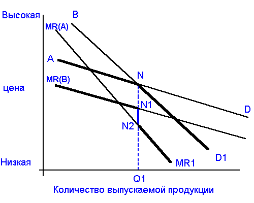 Повышение цен не является примером для фирмы В, следовательно, график спроса в условиях рынка олигополии имеет вид изогнутой кривой ND1. Если фирма не соглашается с повышением цен, то график предельного дохода соответствует отрезку MRN1. Если фирма снижает цены, как и конкурент, то график предельного дохода соответствует отрезку N2MR1. Из-за различий в эластичности спроса график предельного дохода имеет разрыв N1N2 при одном объёме производства, следовательно, снижение цены не может быть компенсировано расширением объёма производства. Модель изогнутой кривой подтверждает, почему фирма в условиях рынка олигополии с осторожностью относится к изменению цен на свою продукцию и стремится к поддержанию стабильных цен, не переводя конкурентную борьбу в ценовую область.