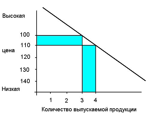 Предположим, что первоначальная цена равна 140 у.д.е., при данном условии фирма продаёт 3 ед. продукции. Чтобы продать 4 ед. продукции фирме необходимо снизить цену до 130 у.д.е. Продав 4 ед. продукции по этой цене, монополист получит доход, равный её стоимости, т. е. 130 у.д.е., но чтобы продать 4 ед. продукции по данной цене монополисту необходимо также снизить цены на первые 3 ед. продукции, в результате этого фирма получит убыток 30 у.д.е. Таким образом, предельный доход в результате продажи 4 ед. продукции составит разницу между общей суммой дохода и величиной убытка: 130-30=100 у.д.е.