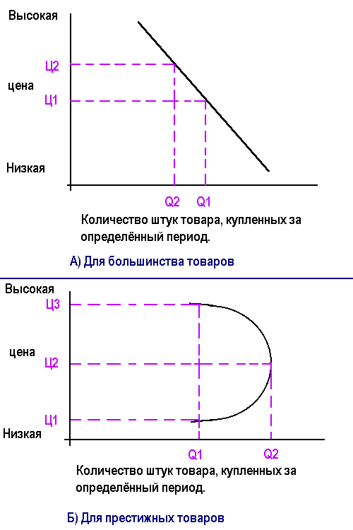 Большинство кривых спроса стремится вниз по прямой или изогнутой линии, как показано на рисунке 2А. Однако в случаях с престижными товарами кривая спроса иногда имеет положительный наклон типа представленного на рисунке 2Б. Парфюмерная фирма обнаружила, что, повысив цену с Ц1 до Ц2, она продала духов не меньше, а больше. Потребители посчитали более высокую цену показателем более высокого качества или большей желательности этих духов. Однако при слишком высокой цене (Ц3) уровень спроса оказался ниже, чем при цене Ц2.
