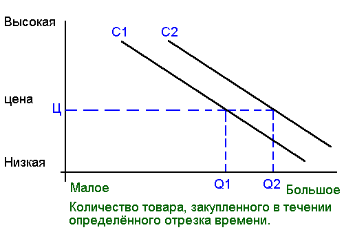 Экономисты установили, что под влиянием неценовых факторов происходит сдвиг кривой спроса, а не изменение её формы. Предположим, что начальный уровень спроса представлен на рис. 11 кривой С1. Продавец запрашивает цену Ц и продаёт Q1 штук товара. Предположим также, что положение экономики неожиданно улучшилось или продавец удвоил свой рекламный бюджет. Повысившийся в связи с этим уровень спроса отражается в виде сдвига вверх кривой спроса из положения С1 в положение С2. Не меняя цены, продавец стал теперь продавать К2 штук товара.