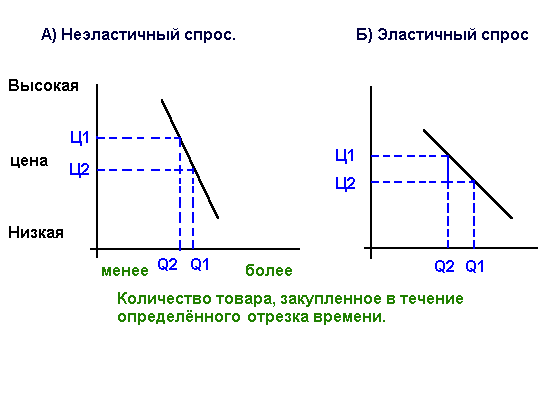 Рассмотрим две кривые спроса, представленные на рисунке 12. Из рисунка 12А ясно, что увеличение цены с Ц1 до Ц2 ведёт к относительно небольшому падению спроса с Q1 до Q2. А из рисунка 12Б видно, что то же самое увеличение цены приводит к существенному падению спроса с Q1 до Q2. Если под влиянием небольшого изменения цены спрос почти не меняется, мы говорим, что он неэластичен. Если же спрос претерпевает значительные изменения, мы говорим, что он эластичен.