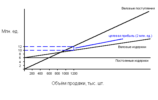Методика ценообразования с расчётом на получение целевой прибыли основывается на графике безубыточности. На таком графике представлены общие издержки и ожидаемые общие поступления при разных условиях объёма продаж. Гипотетический график безубыточности показан на рисунке 14. Независимо от объёма сбыта постоянные издержки равняются 6 млн. ед. Валовые издержки (сумма постоянных издержек) растут одновременно с ростом сбыта. Кривая валовых поступлений начинается с нулевой отметки и поднимается вверх по мере увеличения числа проданных единиц товара. В нашем примере цена товарной единицы является 15 ед. (из расчёта получения 12 млн. ед. за 800 тыс. штук проданного товара).