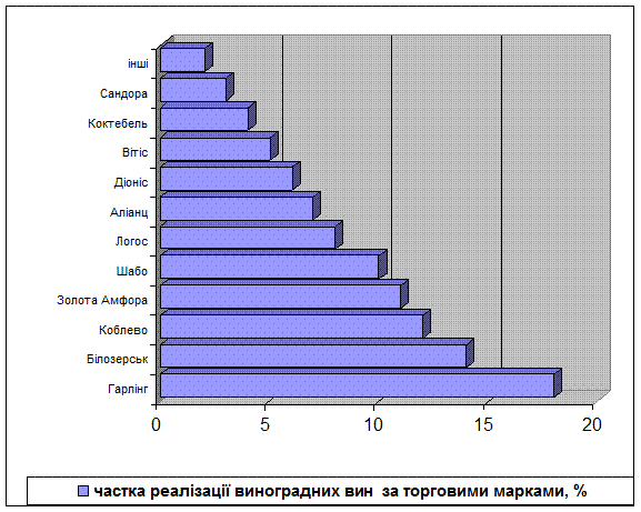 Значний попит і популярність у споживачів мають українські вина виробництва експерементального заводу-раждгоспу „Магарач”, ХВАТ „Массандра”, Інкерманського заводу марочних вин, Винного ДомУ „Логос”, заводу-радгоспу „Сонячна Долина”, ВАТ „Коблево”, СП „Котнар” та мінших підприємств.