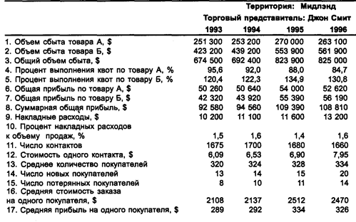 Каждая компания должна определить, какая информация о деятельности торговых представителей представляет для нее особый интерес. Ей следует проинформировать об этом торговый персонал, чтобы работники знали, по каким критериям оценивается их деятельность, и имели возможность улучшить свои показатели.