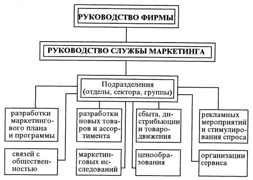 Во главе службы маркетинга стоит ответственный руководитель (вице-президент фирмы по маркетингу, маркетинг-директор и т.п.), который координирует деятельность подразделений службы маркетинга между собой и другими службами фирмы, утверждает план и бюджет маркетинга, дает задания сотрудникам и контролирует их деятельность.