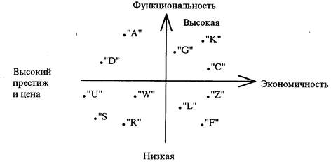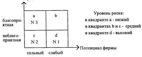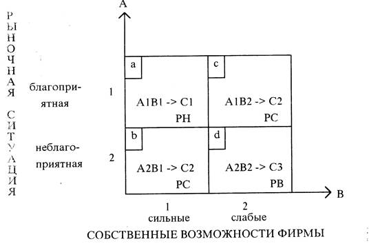 пространственная модель выбора фирмой определенной стратегии маркетинговых действий в зависимости от двух факторов (или комплекса факторов, чаще всего ситуации на рынке и потенциала фирмы): строится с помощью системы координат. |