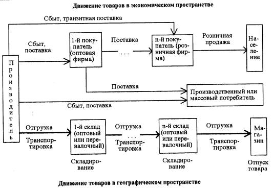 перемещение товаров в экономическом и географическом пространстве: передача прав собственности от одного владельца к другому и транспортировка товара от места его создания к месту хранения и месту конечного потребления. |