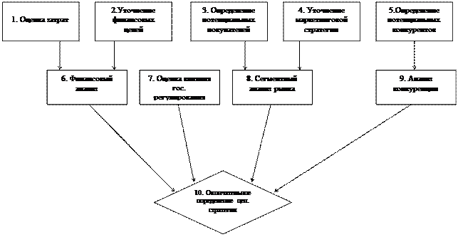 Проводится финансовый анализ (6), сегментный анализ рынка (8), анализ конкуренции (9), осуществляется оценка влияния государства (7). Все работы выполняются соответствующими специалистами, действующими не автономно (это очень важно!), а учитывая интересы коллег.