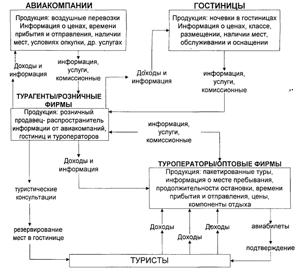 Эти информационные потоки представляют собой не только потоки конкретных данных, но также — услуги и платежи. Услуги, такие как размещение в гостинице, места в самолетах, не выставляются в физическом виде и не осматриваются при продаже в пункте назначения. Единственным путеводителем к наличию и качеству продукта является информация. Следовательно, можно сделать вывод о том, что обеспечение достоверной информацией и скорость ее распространения является столь же важным для выживания туристской отрасли, как и фактическое предоставление потребителям ее услуг.