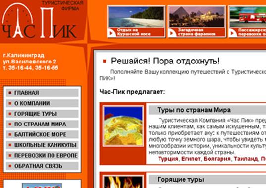 Как уже было сказано ранее, калининградские туристические агентства широко представлены в интернет. Несколько десятков фирм зарегистрированы в различных региональных интернет-каталогах. На фоне тех фирм, что лишь зарегистрированы и имеют, как правило, лишь электронную почту для связи, заметно выделяются те, что имеют собственный сайт. Это уже упоминавшиеся: «Русская Балтика Тур» (http://www.baltur.kaliningrad.ru), туристическое агентство «Час пик» (http://www.chaspik.ru) (см. рис. 2), агентство «Бризен» (http://www.brizen.kaliningrad.ru), агентство «Ариола» (http://www.ariola.kaliningrad.ru), агентство «Мик-Авиа» (http://www.mik-avia.ru), агентство «Балтма Турс» (http://www.baltmatours.com), агентство «Алвис» (http://www.alvis.kaliningrad.ru), агентство «Атури» (http://www.atury.ru) и ряд других.