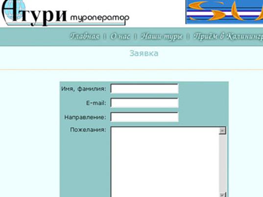 Стоит отметить, что если раньше, буквально год-два назад бизнес сайт в калининградском сегменте интернет — представлял собой одну или две странички землистого цвета, (это касалось не только сайтов туристических фирм, но и всех прочих) то нынешние хотя и не громкие носители раскрученных брендов, но грамотно сделанные — представительные электронные визитки. Очевидно, что местные туристические агентства не дотягивают до уровня признанных лидеров, скажем пионера в этой области, компании Biztravel.com, оборот которой, как ожидается, вырастет с полумиллиарда долларов в 1996 году до 12 млрд. долл. к 2002 году, которая широко известна своим Web-узлом для обслуживания бизнес-путешественников[18] . И тем не менее. Притом что кое-какие услуги on-lineкалининградские туристические агентства могут предложить уже сейчас. Во-первых, на их сайте предоставляется различная информация о предлагаемых турах, а также о т.н. «горящих путевках», что нередко привлекает по цене. И, во-вторых, на некоторых сайтах реализованы некоторые элементы интерактивности, т.е. двусторонней связи, когда потенциальный турист, заполнив электронную форму, высылает заявку в адрес фирмы на предполагаемое путешествие (рис. 3).