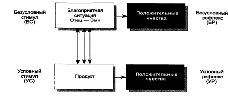На рисунке 1 изображена схема классического обусловливания применительно к продукту. В этом примере, в ситуации отец—сын, которая вызывает положительные психологические реакции или чувства присутствует некий продукт поэтому есть надежда, что эти положительные рефлексы перенесутся и на продукт (эта схема подходит, например, к рекламному объявлению фирмы Kodak, на котором изображен заботливый отец с малышом на руках).