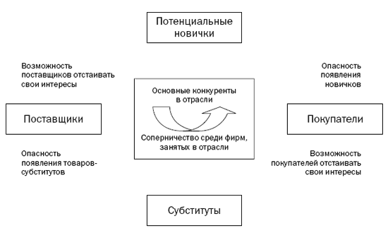 Модель пяти сил (направлений) конкуренции – это эффективный метод анализа основных конкурентных сил, влияющих на положение фирмы на рынке. Эта модель дает возможность более целенаправленно оценить конкурентную обстановку на рынке и на этой основе разработать такой вариант долгосрочной стратегии фирмы, который в наибольшей мере обеспечит ее защиту от воздействия конкурентных сил и одновременно будет способствовать созданию дополнительных конкурентных преимуществ. [4, с. 496]
