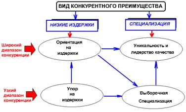 При этом в любой данный момент времени строится стратегия обеспечения конкурентоспособности, опираясь лишь на один из видов конкурентных преимуществ – либо на более низкие издержки, привлекая покупателей относительной дешевизной товаров по сравнению с аналогичными изделиями других производителей, либо на специализацию, вызывая интерес у наиболее взыскательных и требующих, прежде всего, высокого качества клиентов.