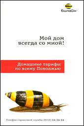 Готовое представление: каждому человеку известно с детства, что улитка – это животное, которое всегда при себе имеет укрытие (раковину, а в человеческом понимании дом ). В данной рекламе было важно показать, что в сети «Билайн» по всему Поволжью действует единый тариф. А это означает, что, выезжая за пределы своей области или республики, вам не нужно беспокоится о роуминге. Поэтому, что касается оплаты сотовой связи, вы как бы остаётесь дома. Т.е. ваш телефон, подключенный к «Билайн», это частичка вашего дома. Здесь телефон, подключенный к «Билайн», можно сравнить раковиной улитки. Ассоциация усиливается ещё и тем, что раковина улитки раскрашена в цвета эмблемы «Билайн». Из всего вышесказанного появляется слоган для этой рекламы: Мой дом всегда со мной!