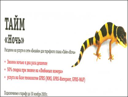 Готовое представление: хамелеон – известный символ изменчивости , приспособления к окружающей среде, к обстоятельствам. В данном случае важно было показать, что новый тариф «Билайн» (Тайм «Ночь»), является изменчивым в зависимости от времени суток. Обладатели данного тарифа днём платят по одной тарификации, ночью по другой – более выгодной. Т.е. как только меняется время суток, ваш тариф меняется как хамелеон, подстраиваясь под новые обстоятельства. В данной рекламе, как и в предыдущей, хамелеон окрашен в фирменные цвета «Билайн».