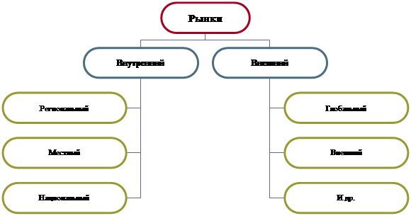 Внутренний рынок подразделяется на региональный местный и национальный и т.д., внешний – на глобальный, то есть мировой, пограничный и так далее.