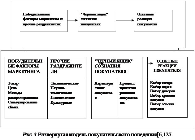 Отправной точкой исследования процесса принятия потребителем решения о покупке является простая модель, представленная на рис. 2. На нем показано, что побудительные факторы маркетинга и прочие раздражители проникают в "черный ящик" сознания покупателя и вызывают определенные отклики.[23,c.64]