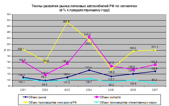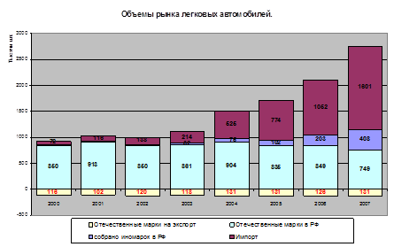 Общий объем рынка неуклонно растет, при этом наибольшие темпы роста наблюдаются в период после 2003 года (Рисунок 2.1.). Следует отметить неравномерность развития отдельных его сегментов. Прирост в наибольшей степени обеспечивается за счет развития сборочных производств иномарок на территории РФ, и импорта новых и подержанных автомобилей.