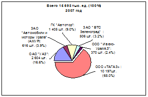 Суммарные объемы производства легковых автомобилей на территории РФ показывают за последние два года умеренный рост (2006 год – 10%, 2007 год – 9%). Однако все в большей степени этот рост обеспечивается за счет сборки иномарок. Так, по количеству, выпущенных автомобилей в 2007 году (Рисунок 2.4., Приложение 2) доля «АвтоВАЗ» в общем объеме производства сократилась с 65 до 56%. На второе место по итогам 2007 года вышел калининградский завод «Автотор», осуществляющий сборку машин семи иностранных марок. В пятерке лидеров также находятся «ТагАЗ», «Автофрамос» и «Форд», также занятые сборкой иномарок. В два раза выросло производство автомобилей иностранных брендов на ЗМА, существенно увеличил объемы сборки иномарок «ИжАвто». Из отечественных легковых автомобилей в плюсе по отношению к 2006 году оказался только «УАЗ». Производство автомобилей всех остальных российских марок снизилось.