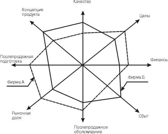 Оценка возможностей фирмы позволяет построить многоугольник конкурентоспособности (рис. 2). По каждой оси для отображения уровня значений каждого из исследуемых факторов (в многоугольнике рис. 2 оценка проводилась только по 8 факторам) используется определенный масштаб измерений (очень часто в виде балльных оценок). Изображая на одном рисунке многоугольники конкурентоспособности для разных фирм, легко провести анализ уровня их конкурентоспособности по разным факторам. Очевидно, что возможно построение многоугольника конкурентоспособности также для продуктов-конкурентов и маркетинговой деятельности фирм-конкурентов в целом.