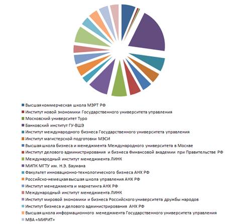 На диаграмме достаточно ярко выделяются три лидера - это АНХ РФ, Банковский институт ГУ-ВШЭ, МИПК МГТУ им. Баумана. Доли остальных участников рынка приблизительно равны и колеблются в основном в пределах 3-6%. С 80-х годов прошлого века основным показателем концентрации рынка считается индекс Херфиндаля-Хиршмана, определяющийся как сумма квадратов долей всех фирм, действующих на рынке. Индекс Херфиндаля-Хиршмана предоставляет информацию о сравнительных возможностях фирм влиять на рынок в условиях разных рыночных структур. Если рассчитать этот индекс для организаций, предлагающих свои программы MBA, на основе вышеприведенной таблицы, получим приблизительно 1100, что говорит об умеренной концентрации рынка. Дисперсия долей фирм на рынке приблизительно равна 2, а это, в свою очередь, свидетельствует о небольшом "разбросе" рыночных долей. Емкость рынка MBA, исходя из этой же таблицы, приблизительно равна 200 млн. долларов. Любопытно отметить, что в 2004 году те же самые 200 млн. составляли емкость всего рынка российского бизнес - образования.
