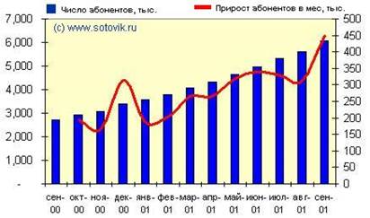 Итак, если говорить о тенденциях, то следует отметить, что продолжался устойчивый рост числа абонентов, услугами сотовой связи стали пользоваться еще более миллиона россиян, так что опровергнутыми оказались буквально все прогнозы относительно возможного числа абонентов, сделанные в начале 2006 года. По итогам 2006 число абонентов сотовой связи в России составило 18,240,000. Можно предположить, что до конца 2003 года окажется взят барьер и 25,000,000 абонентов, так что Россия прочно обосновалась на втором месте в Восточной Европе. [5,c.45]