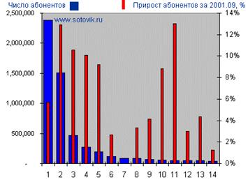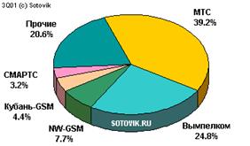 По-прежнему остается наибольшей доля Москвы в "сотовой" формуле Россия=Москва+С. - Петербург+Регионы. Итоги развития сотового рынка Москвы складываются под влиянием соотношения сил трех сотовых компаний: "Мобильные ТелеCистемы", "Вымпелком" и "Московская сотовая связь", а также компании "фиксированной" связи по технологии CDMA - "Персональные коммуникации". Последняя пока что обладает наименьшей абонентской базой в Москве и "де-юро" не является "полноправным" сотовым игроком. В связи с этим "Сотовик" не учитывает имеющиеся данные о числе абонентов "Сонет".