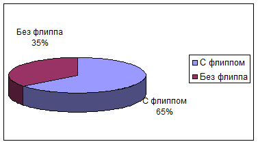 Из данного рисунка видно, что в ООО "Мобильный мир" ассортимент сотовых телефонов в основном состоит из обычных телефонов, то есть телефонов без флиппа - 35%, а остальные 65% ассортимента составляют сотовые телефоны с флиппом.