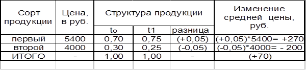 Таблица 2. Влияние сортового состава на изменение среднего уровня цены изделия А .