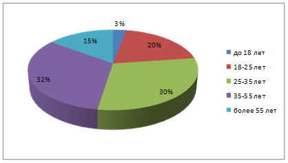 Как видно с рисунка 4, преобладающее большинство клиентов (33%) занимают 35-55 летние, 30% - 25-33 летние, 20% - 18-25 летние, 15%