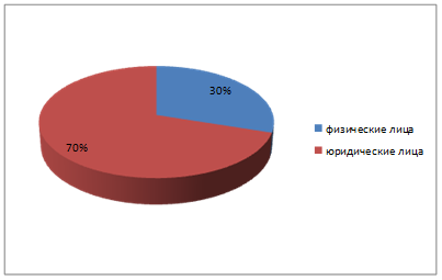 Как видно на рис. 5, 60% клиентов занимает мужское население, и 40% женское. На рис. 6 юридические лица занимают 70%, а физические 30%.