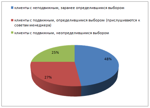 Преобладающее число 48% составляют клиенты с неподвижным, заранее определившимся выбором, 27% - клиенты с подвижным, определившимся выбором, прислушивающиеся к советам менеджера, 25% - клиенты с подвижным, не определившимся выбором.