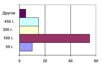 В ходе разовой покупки 77% опрошенных в независимости от вида фасовки приобретают одну упаковку, 20% – две, всего 5% – три и более. Причем 55% респондентов ответили, что они предпочитают упаковки чая массой 100г .