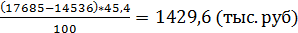 | Изменение товарооборота (Р1 -Р0 )*Увп0 /100 = (17685+14536)*45,4/100 | 1429,6 |