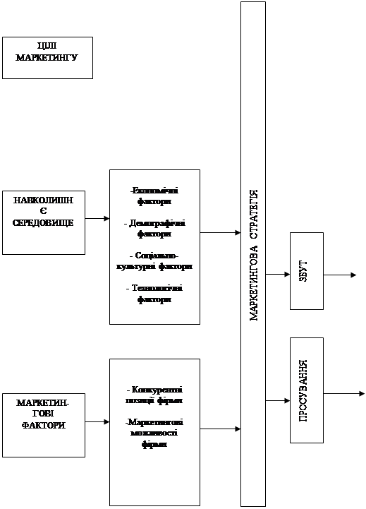 Маркетинг у перекладі з англійського означає “діяльність, зв'язану з ринком". Сутність маркетингу можна виразити як інтеграцію зусиль всіх учасників ринку для формування і забезпечення попиту на взаємовигідній основі. Маркетинг являє собою комплексний, системний підхід до рішення проблем ринку й охоплює всі стадії руху товару: вивчення потреб і попиту, внутрішнього і зовнішнього середовища підприємства, розробку продукції і програм її виробництва, установлення цін, рекламу, надання різного роду послуг, зв'язаних із продажем і споживанням, організацію післяпродажного обслуговування й утилізації виробів, що вийшли з уживання [9].