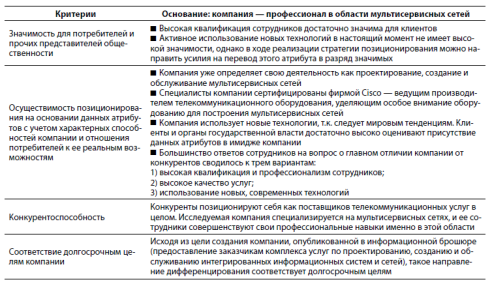 На данном этапе необходимо определить, какими преимуществами в плане тех или иных атрибутов имиджа обладает компания. Нужно понять, по какому атрибуту или совокупности атрибутов будут дифференцировать компанию клиенты. Атрибуты имиджа и репутации, выбираемые в качестве основы для позиционирования, оцениваются по следующим критериям: