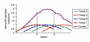 Из графика видно, что наибольшую прибыль розничная торговля получает в промежутке времени A'-A", когда в ассортименте преобладают товары, находящиеся в стадии роста и зрелости, однако, при этом в наличии имеются новые товары, только завоевывающие свое место на рынке, а также товары, спрос на которые падает.