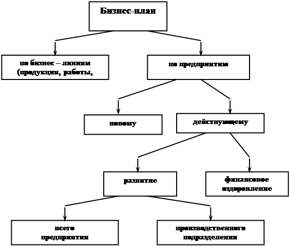 Бизнес – планы разрабатываются в различных модификациях в зависимости от назначения: по бизнес – линиям (продукция, работы, услуги, технические решения), по предприятию в целом (новому или уже действующему). Бизнес – план может быть нацелен как на развитие предприятия, так и на его финансовое оздоровление. Также может планироваться деятельность всего предприятия или его отдельного подразделения.