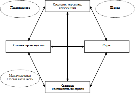 Подобный подход активно используется в экономически развитых странах (Финляндия, США и др.) с начала 90-х годов ХХ века. Он основывается на теории Майкла Портера, а точнее на так называемой модели «Даймонд» (рис.4). Многие оценки и прогнозы, сделанные рамках теории Портера, оказались пророческими, а промышленная политика, одной из основ которой наравне с построением национальной инновационной системы явился учет особой природы конкурентоспособных производств, принесла блестящие результаты. Так, например, в 2005 г. маленькая Финляндия удерживала 40% мирового рынка оборудования для производства целлюлозы и почти 30% рынка бумагоделательного оборудования. Доказав свою состоятельность к пониманию микро- и мезоэкономических процессов в жесткой конкурентной среде «ромб Портера» стал сначала базовым аналитическим инструментом чиновников и управленцев всех уровней в развитых странах, а затем с некоторыми оговорками был подхвачен отечественными управленцами.