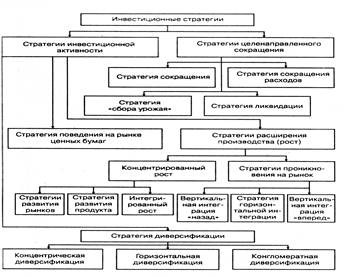 Инвестиционные стратегии - это стратегии формирования инвестиционного портфеля. С этих позиций можно выделять стратегии, направленные на развитие деятельности компании, ее рост, и стратегии, направленные на сокращение этой деятельности (рис.1).