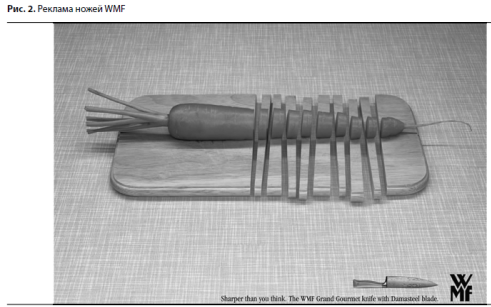 Итак, как же иначе донести информацию о качестве бинокля, ножа или порошка, кроме как проиллюстрировав денотативное содержание слогана, противопоставив смысл денотату высказывания? Метафора, метонимия, гипербола, синекдоха и иные тропы задают новое звучание стандартным рекламным характеристикам. Тропы помогают выразить одну и ту же мысль разными способами ("Острее, чем вы думаете", "Победите жир", "Смертоносен для блох", "Вы решите, что ваша собака - гений", "Ваши ножки тоже могут быть сексуальны"). Можно предположить, что и в этих случаях именно слоган служит основой для создания последующего визуального ряда. Однако уже на данном этапе вырисовывается определенная проблема. Если понятия "смертоносен", "гений", "сексуальность" дают возможность сравнительно легко подобрать понятные визуальные образы (и именно это позволяет предположить первичную роль слогана), то как быть с фразой "Острее, чем вы думаете"? Что в данном случае служит основой для поиска образа? Острее, чем что? На помощь снова приходят художественные приемы. Например, иллюстрацией для обозначенной фразы может служить визуальная гипербола, которая при наличии фантазии позволит изобразить результат работы очень острого лезвия (рис.2).
