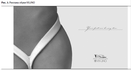 Следует заметить, что вербальные и визуальные художественные приемы не всегда повторяют друг друга. Так, в случае с сексуальной обувью для визуализации использована метонимия. Снятая в определенном ракурсе ножка напоминает изгибы женского тела (рис.3).