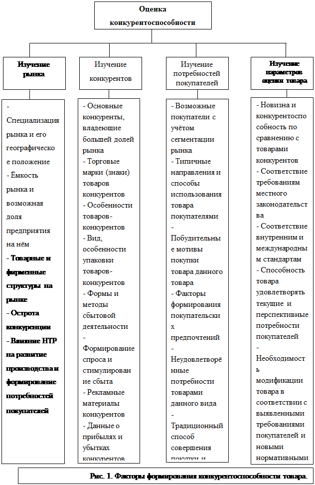 Товар - главный объект на рынке. Он имеет стоимость и потребительную стоимость (или ценность), обладает определенным качеством, техническим уровнем и надежностью, задаваемой потребителями полезностью, показателями эффективности в производстве и потреблении, другими весьма важными характеристиками. Именно в товаре находят отражение все особенности и противоречия развития рыночных отношений в экономике. Товар - точный индикатор экономической силы и активности производителя. Действенность факторов, определяющих позиции производителя, проверяются в процессе конкурентного соперничества товаров в условиях развитого рыночного механизма, позволяющего выявить отличия данного товара от товара-конкурента как по степени соответствия конкретной общественной потребности, так и по затратам на ее удовлетворение. Для этого товар должен обладать определенной конкурентоспособностью.